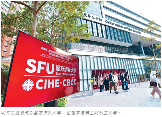 2024年1月9日,明爱专上学院(明专)正式获批,成为香港本土第三间私立大学,英文及中文名分别更改[Saint Francis University] 及圣方济各大学]。在2023/24学年,共开办13项经本地评审的自资专上课程,其中包括12项学士学位课程及一项硕士学位课程,共有约3000名全日制学生及500名兼读制学生。